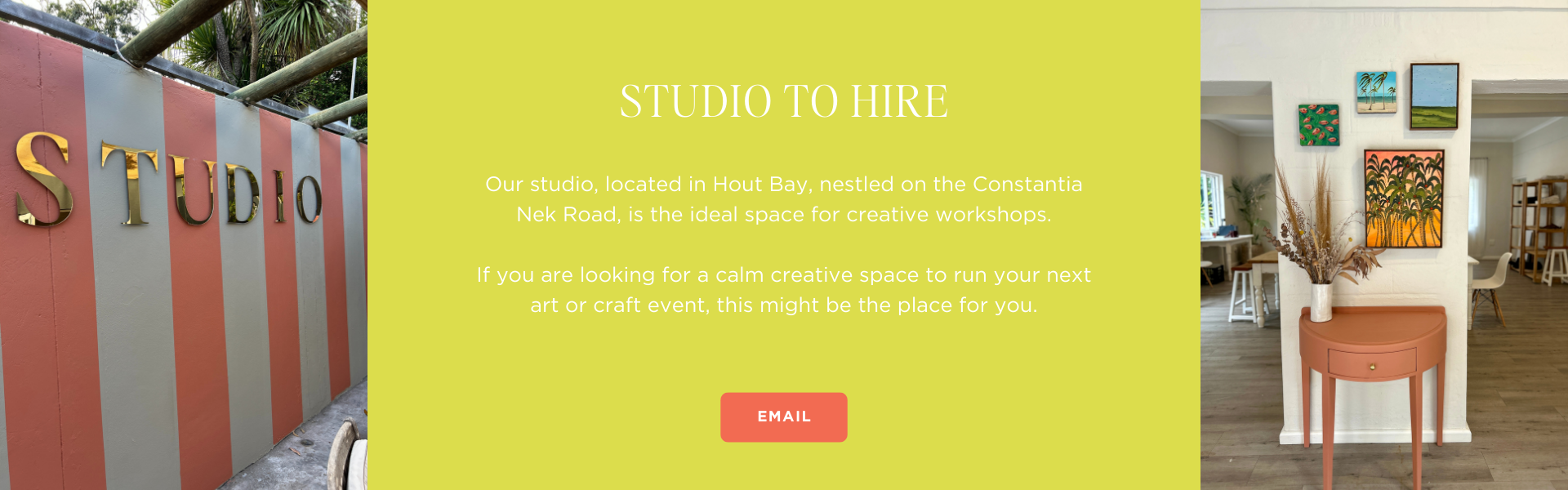 Our light-filled creative studio is tucked along Constantia Nek Road in Hout Bay — easily accessible and surrounded by mountain views that instantly inspire.